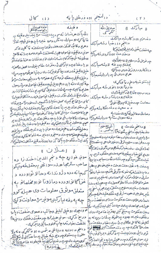 د دی جریدی لو مړی ګڼه د( ۱۳۳۷ هجری شمسی ) کال د میزان په ۳۰ مه خپره شوی ده . دا ګڼه او ځینی نوری ګڼی یی هم دا اوس زمونږ په لاس کښی دی او د قلمی جریدو ډیر ه ښه بیلګه ده .