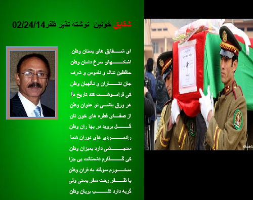 ظفر گرامی ، سروده زیبا و خواندنیست . شهادت افسران و سربازان قهرمان وطن را به خانواده های شهدا و ملت افغانستان تسلیت عرض نموده روحشان شاد و جنتها نصیب شان باد . موفق باشید. مهدی بشیر