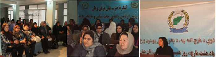 در شروع محفل محترم داکتر محمد آصف بکتاش – معاون اول حزب ملی ترقی وطن بر مبارزات تاریخی و وضعیت کنونی زنان افغانستان روشنی انداخت. بعد از آن محترمه عادله کوهستانی به نمایندگی از شورای زنان حزب ملی ترقی وطن به مهمانان خوش آمدید گفته و بر ضرورت شدت مبارزات زنان برای حقوق مدنی شان تاکید نمود. وی از زنان خواست تا در وقت رای دادن به کاندیدان ریاست جمهوری توجه بیشتر به خرچ داده و از کاندید حمایت نماید که به حقوق زنان عقیده داشته و برای کار عملی در این مورد اراده داشته باشد.