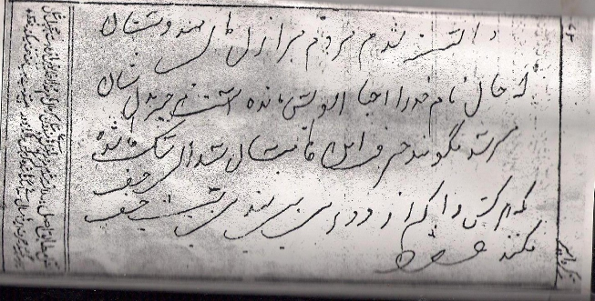 برپدر همۀ شما مرزا هایی که درین کاغذ مُهر ودست خط کرده اید، لعنت وبرشما هزار لعنت برهرکدام شماباد. ببرکت ارواح پاکان درگاه خداوند، دل شما هاهرگزکار نمیخاهد( نمی خواهد)همۀ شما مردار وپدر آزار ومادرآزار استید، تمام مرداری دفتر ها ازشمایان است. فقط . امیرعبدالرحمن بقلم خد( خود) نوشتم فقط .” (14)