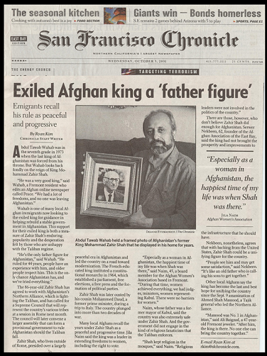 پس از صحبت تیلفونی با جناب محترم عبدالتواب وهاب کالیگراف، دیزاینر و نقاش چیره دست کشور و صحبت ها روی موضوعات مختلف، جر و بحث کوتاهی هم داشتیم روی هفتمین سالگرد وفات شاه اسبق کشور (بابای ملت) و مقالات ذیربط در سایت ها. ایشان در جریان گفت و شنود ما از مصاحبۀ شان که سالها پیش در فریمانت کلیفورنیا با اخبار سانفرانسسکو ترونیکل (san Francisco Thronicle ) داشتند یاد دهانی کردند که برای من خیلی جالب و دلچسپ بود.