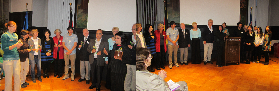 سپس خانم داکتر نینا کیول هوفر مسؤول امور مالی انجمن تقدیر نامه های انجمن مدد رسانی افغانی را به پاس پشتیبانی صادقانه و بشردوستانه از فعالیتهای انجمن به چهار شخص و دو نهاد مدنی ، تقدیم کرد، و دختر خوردسالی با لباس قشنگ افغانی دسته های گل را به آنها پیشکش نمود.