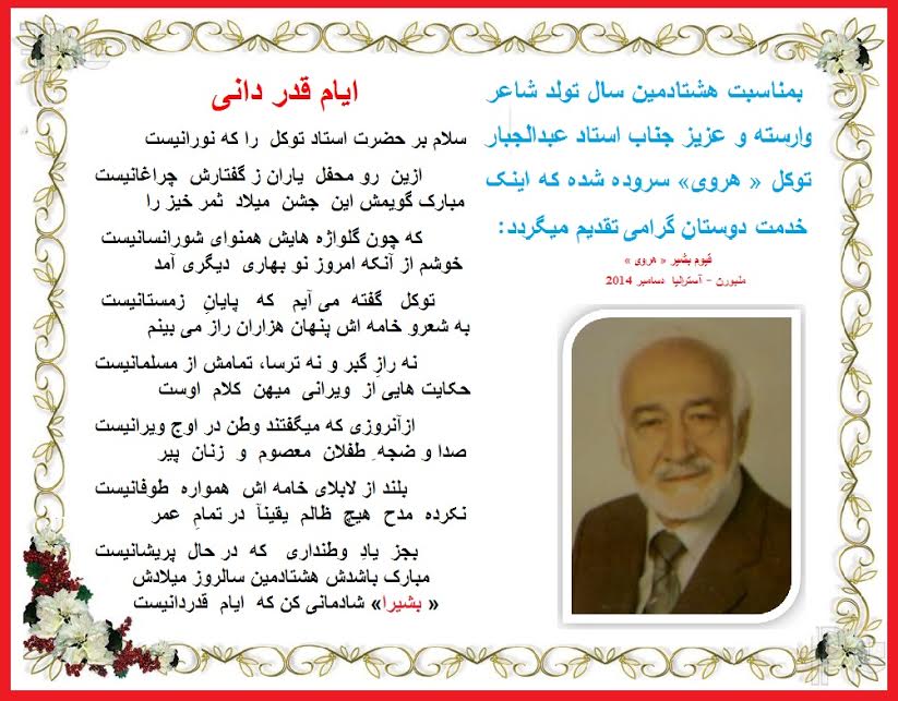 درود به قیوم عزیز ، سروده زیبا و مانند همیشه عالیست. منهم هشتادمین سال تولد استاد عبدالجبار توکل « هروی » را به خودشان و خانواده محترم و دوستان فرهنگی از صمیم قلب تبریک عرض نموده ، امیدوارم سالهای سال زندگی خوشی را سپری کنید . زنده وسلامت باشید. مهدی بشیر – کانبیرا – آسترالیا