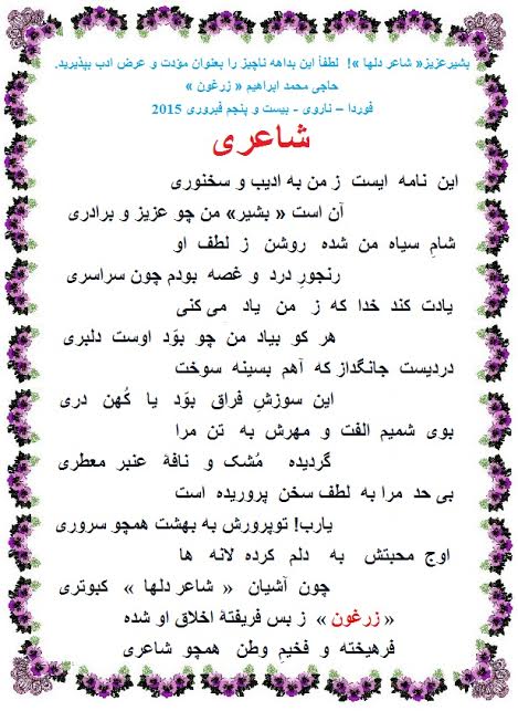 درود به جناب محترم حاجی محمد ابراهیم « زرغون » سروده زیبا و عالیست . موفق وسلامت باشید. مهدی بشیر
