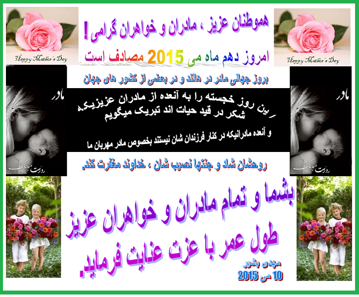 دوستان محترم ، خواننده گان عزیز ، همکاران گرامی سایت ۲۴ ساعت و فیسبوک های آن ، ضمن عرض سلام نسبت مشکلات تخنیکی امروز که روز مادر در کشور هالند و بعضی کشور های دیگر بود تنوانستم مطالب شما را بوقتش نشر کنم و اکنون آنها را نشر کردم .امیدوارم مادران و خواهران گرامی که شکر در قید حیات اند مراتب تبریکات بنده را به پذیرند و آرزوی سعادت برایشان مینمایم. همچنان آن عده مادران عزیزیکه در قید حیات نیستند ، مانند مادر گرامی بنده روح شان را شاد میخواهم و برایشان طلب رحمت و مغفرت مینمایم.