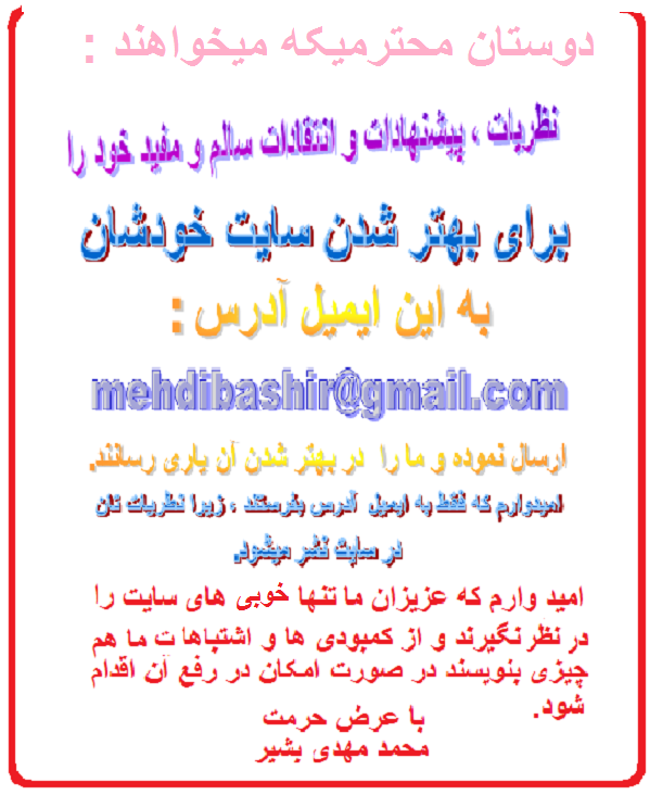 دوستان محترم ، و فرهنگیان عزیز ، لطفا نظریات ، پیشنهادات ، و انتقادات سالم خود را فقط از طریق word الی دوشنبه 21 / 9 / 2015 به اين ايميل آدرس : mehdibashir@gmail.com جهت نشر بفرستید . زنده وسلامت باشید. مهدی بشیر