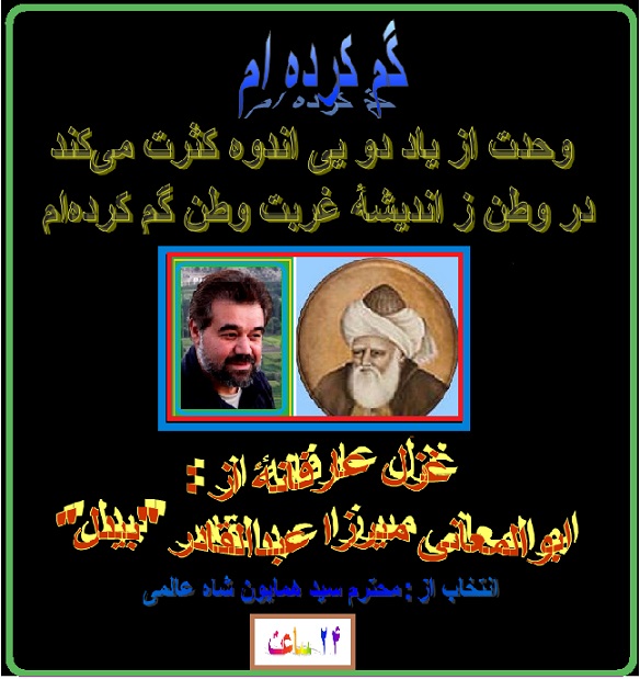 درود به جناب عالمی عزیز ، روح ابوالمعانی میرزا عبدالقادر “بیدل” شاد . سروده زیبا را انتخاب نموده اید ، خیلی عالی است . و ذوق تان قابل قدر است. موفق وسلامت باشید. مهدی بشیر