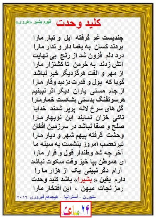 تشکر قیوم جان از سروده زیبا و مملو از احساس پاک و طندوستی ات . اکنون باور داشته باش که مردم عزیز کشور ما ، مردم دیروز نیستند و حالا تمام این خاینین ، وطنفروش ها ، متعصبین ، جهاد نما ها و تفرقه انداز ها را شناخته اند و فریب شانرا نمیخوذند و همه باهم متحدانه زندگی میکنند و در راه صلح وامنیت تلاش مینمایند تا کشور ما آرام و آباد گردد. موفق وسلامت باشید. مهدی بشیر
