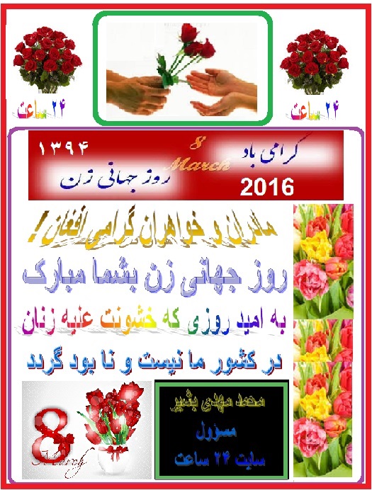 امروز سه شنبه ۱۸ حوت ۱۳۹۴ خورشیدی برابر است به هشتم مارچ ۲۰۱۶ میلادی مصادف است بروز جهانی زن ، یعنی مادر ، خواهر . من این روز جهانی را به تمام مادران ، خواهران افغان ، خانواده های همکاران عزیز ، خانم های همکار ۲۴ ساعت ، تما م خواننده گان محترم ، خانم های دوستان فیسبوک های ۲۴ ساعت و زنان جهان تبریک عرض میکنم . امیدوارم روزی برسد که همۀ شان در یک فضای کاملا صلح و صفا بدون تعصبات قومی ، مذهبی ، زبانی ، منطقوی و نژادی با هم متحدانه زندگی خوشی را سپری کنند و با برادران خود همکاری صمیمی نمایند.