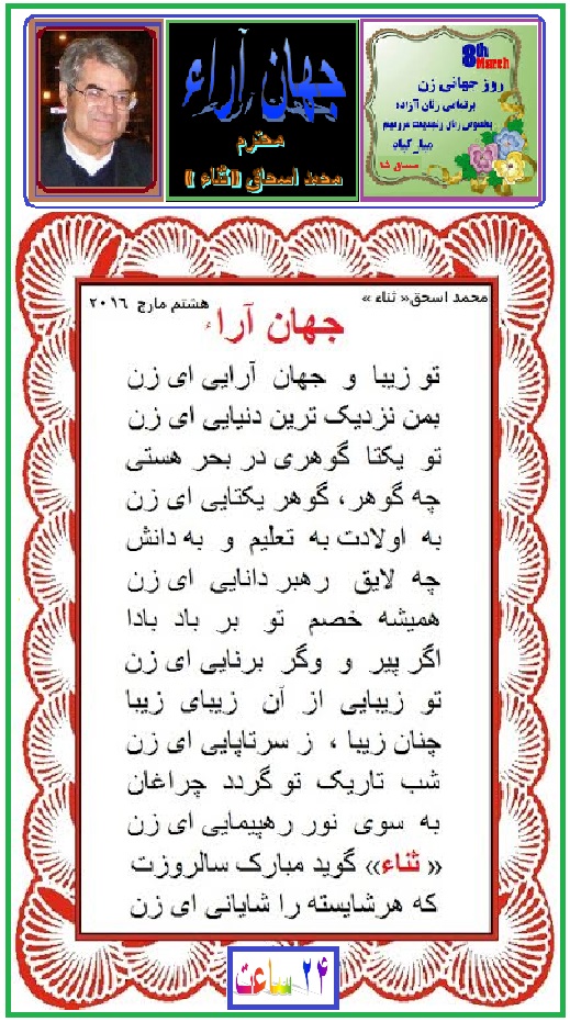 درود به جناب استاد ثنا عزیز و تشکر از سروده زیبا تان. روز جهانی زن بشما ، خانواده محترم زنان هموطن ، زنان همکار 24 ساعت وفیسبوک های آن تبریک عرض میکنم، امیدوارم که مادران وخواهران کشور عزیز ما و خارج از کشور همیشه خوش و آرام زندگی کنند. موفق وسلامت باشید. مهدی بشیر