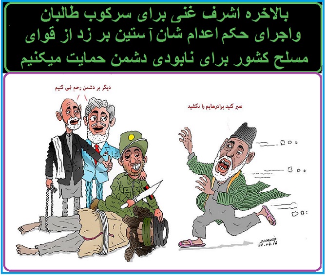 باید با جرات اعلام کرد که حرفهای که غنی ودار وسته اش میگویند همه دروغ و فریب دادن مردم مظلوم ما است. غنی هیچوقت برادران جانی و وحشی خود وکرزی را که طالبان خونخوار اند اعدام نمیکند . زیرا این بی کفایت با هد ىستي كرزي خايين و وطنفروش برادران وحشی خود و کرزی فاسد را از زندان های کشور آزاد کردند و مردم مظلوم ما را به شهدادت رساندند. حرف های این ها بشمول عبدالله دروغ است ، مانند شهید فرخنده و چندین شهید دیگر بالای دوسیه اش سر پوش گذاشتند . لعنت به تمام دروغگو های دولت و حشت ملی وحامیان فاسد ، بی غیرت و بی کفایت کشور.