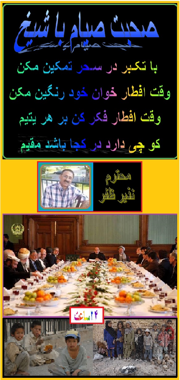 درود به برادر محترم ظفر عزیز شاعر دلها ، تشکر از سروده زیبا تان . ماه مبارک رمضان بشما و خانواده محترم مبارک .طاعات و عبادات تان قبول در گاه حق . به امید روزی که این خایین ها اول دسترخوان مردم غریب ، بینواو مظلوم ما راهموار کنند تا آنها افطار نمایند و بعدآ خود آنها هرچه میخواهند زهر مار نمایند . موفق و سلامت باشید. مهدی بشیر