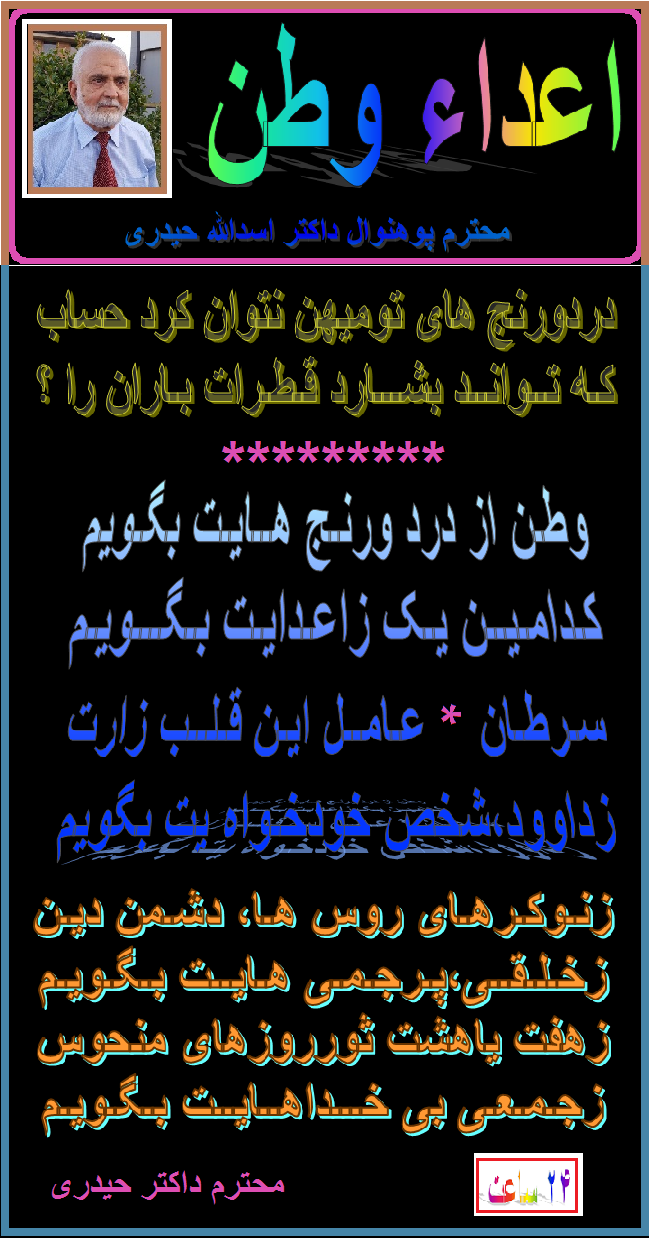بعد از تقدیم سلام وآرزوی صحتمندی تان، جهان سپاس ازنشر مطالب ارسالی من وازحسن نظر تان.یکتعداد دشمنان وخائنین وطن ما به جهنم واصل شده اند وانشأالله دیگران شان نیز به آنها ملحق خواهند گردید. پشت هر صبح شامی وپشت هر شامی صبحی آمدنیست این حالت بد وبی امنی و کشت وکشتار بی گناهان سرانجام پایان یافتنی خواهد بود. صد وای به حال ظالمان که درمحکمهء عدل الهی از اعمال شوم خود چه جوابی خواهند داد. بادرود فراوان داکتر حیدری