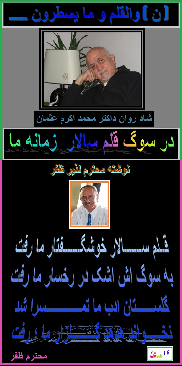 درود به برادر عزیز ظفر گرامی ، و تشکر از نوشته عالی تان . بنده به نماینده گی از همکاران و خواننده گان محترم سایت 24 ساعت و دوستان فیسبوک های آن ، مراتب تسلیت و همدردی خود را نسبت وفات دانشمند و نویسنده بزرگ کشور شاد روان داکتر محمد اکرم عثمان به خانواده محترم مرحومی ، جامعه فرهنگی و هموطنان عزیز تقدیم میکنم. روحش شاد ، یادش گرامی و خلد برین جای شان . به بازماندگان شان صبر جمیل آرزو میکنم. با عرض حرمت مهدی بشیر