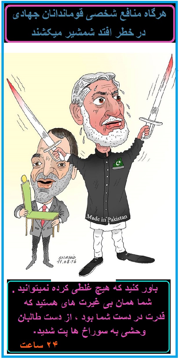 درود به جناب عتیق شاهد گرامی و تشکر از کارتون های واقعی تان. اکنون که زور آماده حرف از شمشیر و غیره میزند . این تفنگسالار ها همان ترسو های بی غیرت اند که کشور را تسلم طالب های وحشی نمودند وخود شان در سوراخ های کوه ها پت شدند تا بادار شان امریکا به کمک شان رسید. لعنت ونفرین به این چپاولگر ها که دارایی ملت را به باداران خود فروختند. و پول های آنها را به بانکهای خارج و فامیل های خود به خارج فرستادند. نفرین به همه جنایتکاران و دزدان. موفق باشید. مهدی بشیر