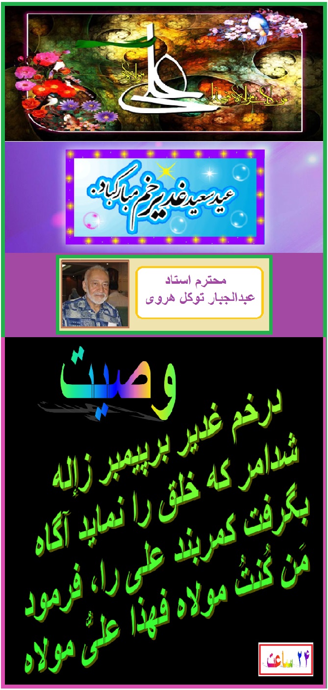 درود به استاد محترم جناب آقای توکل هروی و تشکر از سروده زیبا و عالی تان . عید سعید غدیر خم بشما ، خانواده محترم و هموطنان عزیز و مسلمان جهان مبارک . موفق وسلامت باشید و عید خوشی را سپری کنید. مهدی بشیر