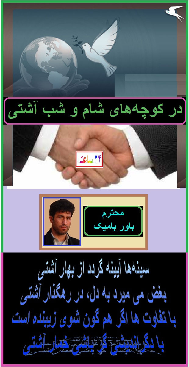 درود به استاد عزیز آقای عنایت الله باور بامیک. تشکر از سروده مملو از احساس تان ، عالیست . اما آشتی با جنایتکاران و تفنگسالار ها وگلبیدین حکمتیار راکت انداز و طالب ها ی وحشی برادران کرزی خایین و غنی فاسد درست نیست. به امید صلح و امنیت وآرامی مردم افغانستان و جهان بدون هر نوع تعصب ، تفرقه و خونریزی. موفق وسلامت باشید. مهدی بشیر