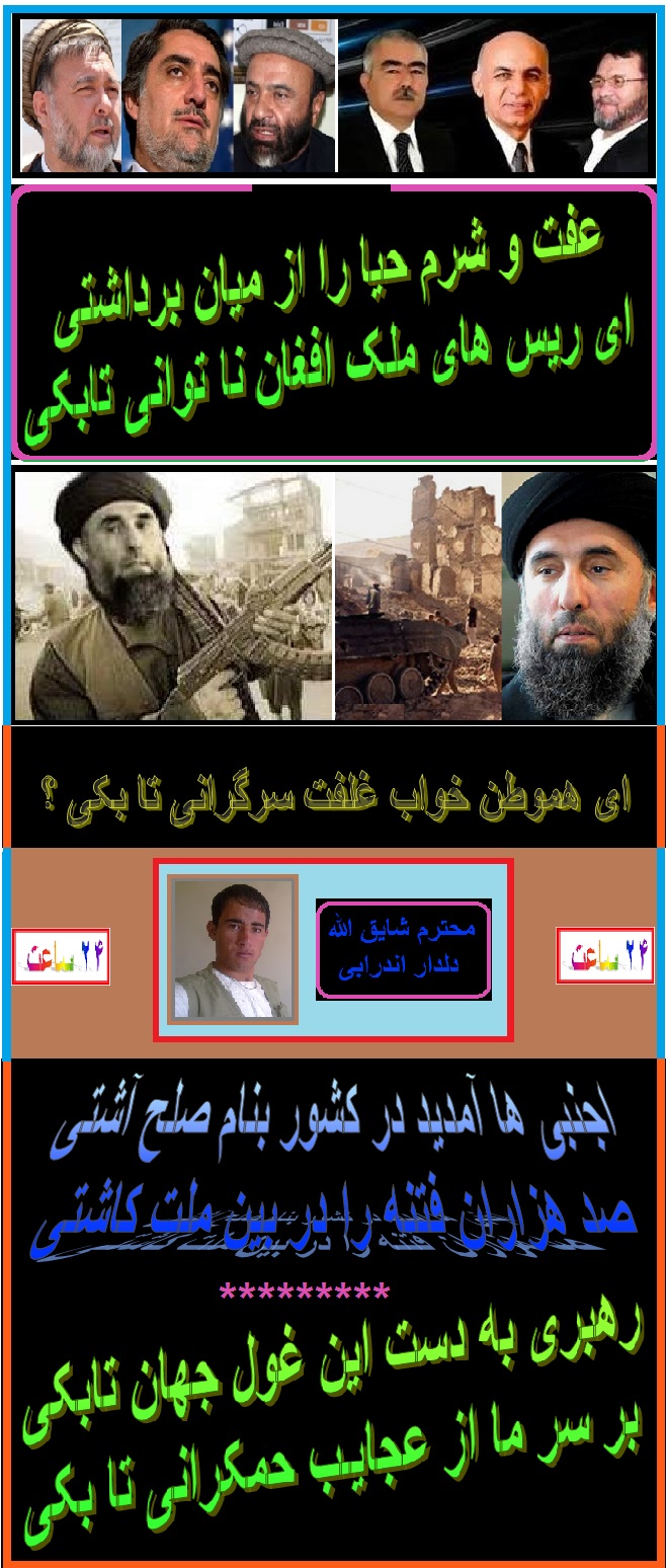 گلبیدین راکیتیار به کشور بیاید .خداوند متعال زنده نبیاره این کثیف نا بکار به غیر ، تفرقه انداختن ، تعصبات قومی ، مذهبی ، زبانی و منطقوی را دامن زدن دیگر هیچ کار نخواهد کرد .اما رهبران را گرچی خو رهبر خطاب کردن اینها خوب نیست چون همه فاسد و همه قاتل هستند وهمه کرسی پرست در خواب غلفت هستند افسوس به حال این ملت بیچاره از دست این بی کفایت های بی غیرت .اکنون در ولایات ها چی جریان دارد ..