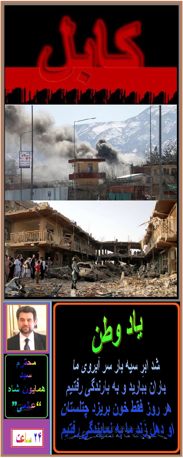 دولت وحشت ملی غنی فاسد وعبدالله بی غیرت به همکاری اتمر لنگ و دارودسته شان این خایین های وحشی را مانند گلبیدین راکت انداز و دیگر جانی ها را به کشور دعوت میکنند. لعنت ونفرین به تمام این خایین ها ، جانی ها ، وحشی ها ووطنفروش ها . روح شهدای امروز شهر کابل شاد وخلد برین جای شان. به خانواده هایشان و مردم افغانستان تسلیت عرض میکنم. مرگ به قاتلین امروز و حامیان وطنفروش آنها.