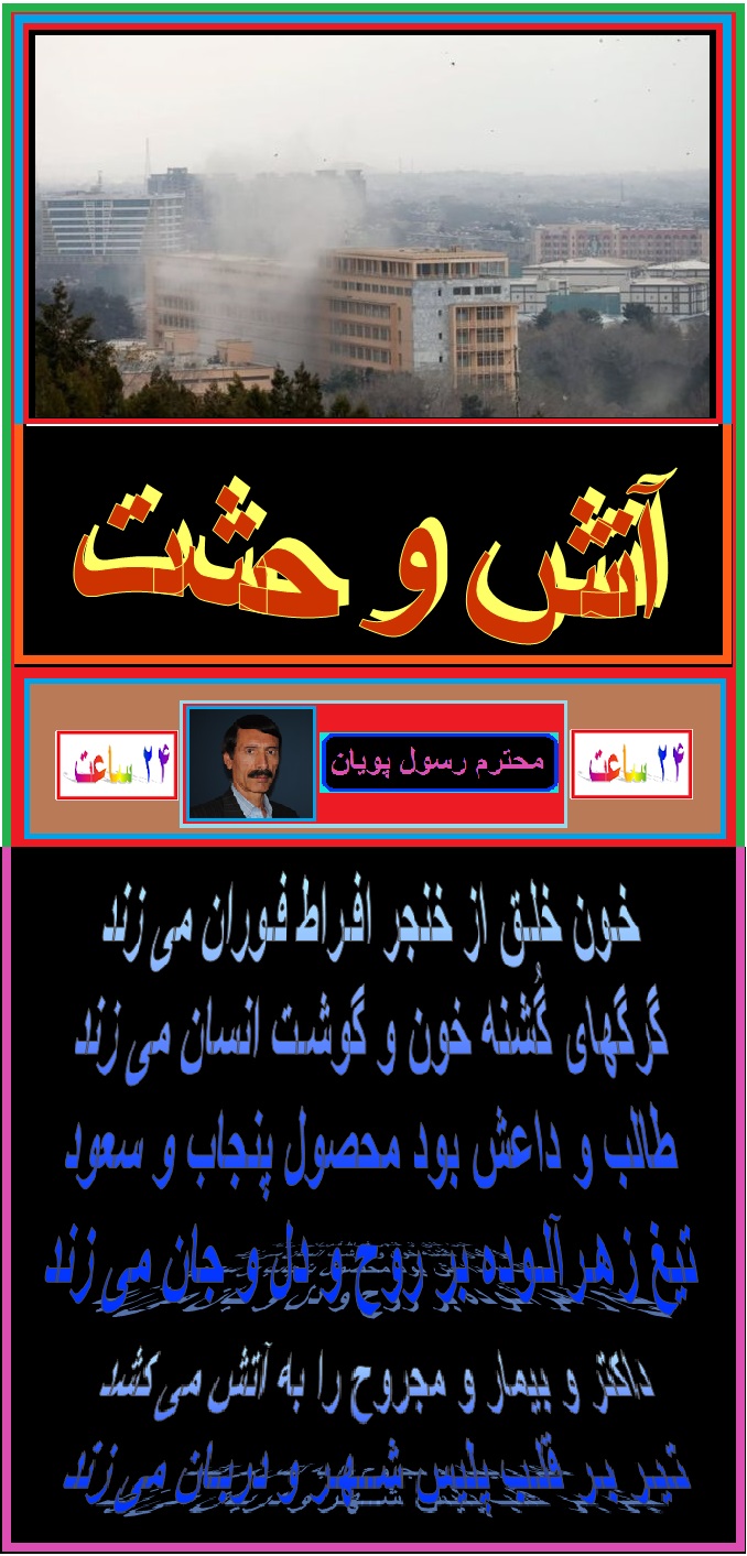 لعنت و نفرین به به دولت بی غیرت وحشت ملی که تعداد زیادی از داکتران و مریضان شفاخانه چهار صد بستر را توسط طالبان وحشی و داعشی های چانی برادران غنی و کرزی وطنفروش به شهادت رساندند و یا زخمی نمودند . روح شهدای این حادثه المناک شاد و جنتها نصیب شان . درود به جناب پویان عزیز . موفق باشید. مهدی بشیر