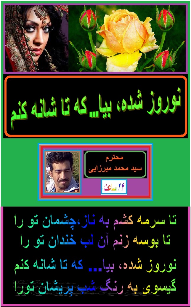 درود به برادر عزیز و گرامی آقای سید محمد میرزایی ، تشکر از سروده عالی تان. فرارسیدن سال نو خورشیدی و نوروز باستانی را به شما ، خانواده محترم و هموطنان عزیز تبریک عرض میکنم. به امید سال بدون جنگ وخونریزی در کشور . موفق باشید. مهدی بشیر