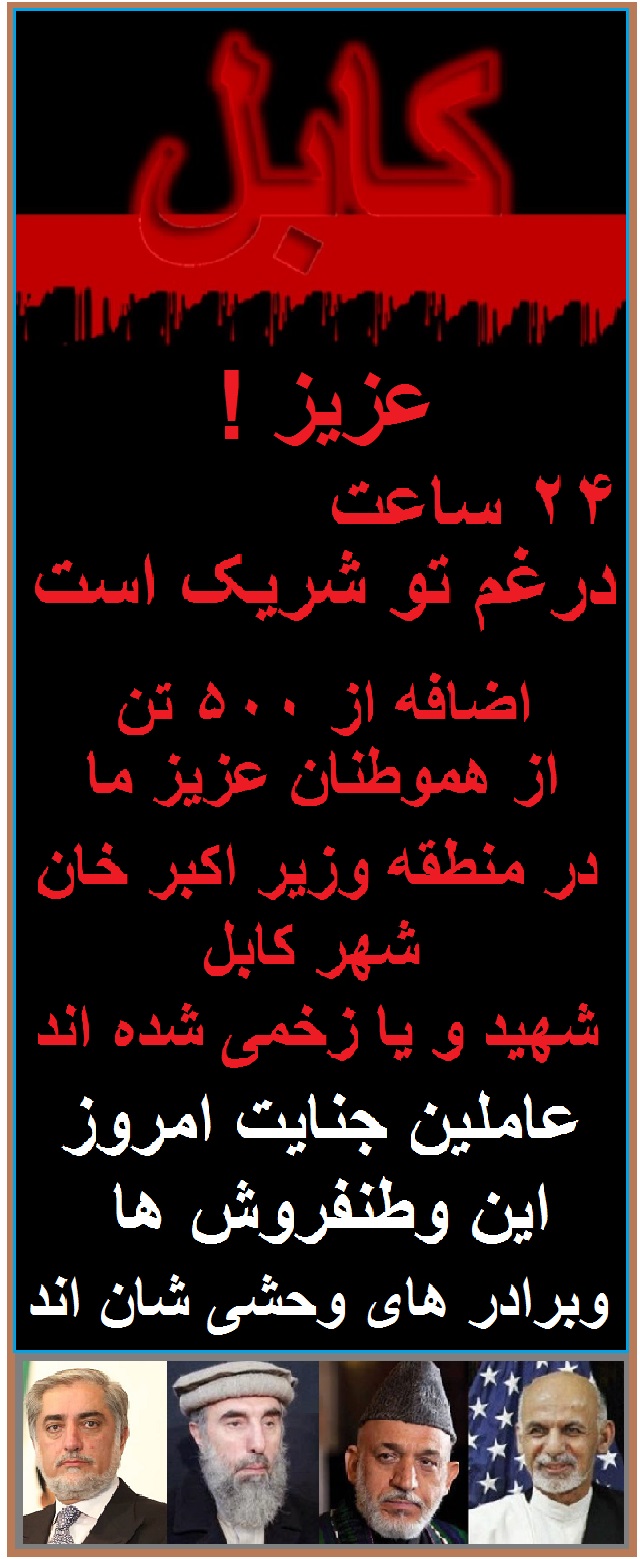 جالب این است که چرا فامیل های غنی ، کرزی ، حکمتیار ، عبدالله ، اتمر و دیگر وطنفروش ها و جنایتکاران در  این انفجار ها روانه دوزخ نمیشوند . پس به همه هویدا است که خود این آدمکش ها برای بقای قدرت در این حوادث المناک دست دارند.