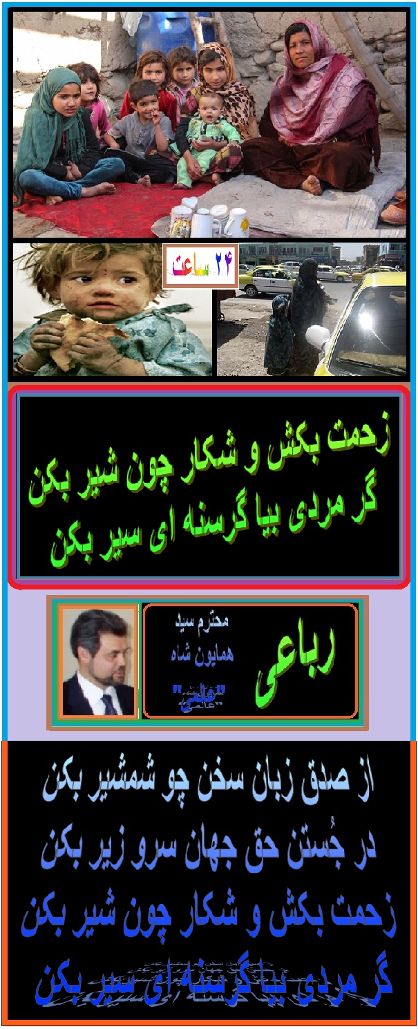 درود به برادر گرامی آقای عالمی عزیز ، رباعی زیبا و مملو از احساس است. مگر ارگ نشینان فاسد و دولت وحشی میگذارند که مردم کشور ما زبان شان مانند شمشیر باشد و حقایق داخل و خارج را بیان نماید ؟ . مردم ما شب وروز زحمت میکشند ولی شکم شان همچنان گرسنه است . متاسفانه این مردم بیچاره نمیتوانند که شکم خود را سیر نمایند چی رسد که شکم مردم گرسنه را سیر کنند ، اما این نا مرد های ارگ نشین و وطنفروشها همچنان دولت وحشت ملی آنقدر بی غیرت اند و به دالر ضرورت دارند و از پولهای که بنام مردم شان از کشور ها ی خارج میرسد نمیخواهند که شکم گرسنه گان کشور را که محتاج یک لقمه نان خشک اند سیر نمایند در عوض به حساب های شخصی خود واریز مینمایند. تا در آینده خانواده هایشان همچنان مانند اکنون آرام باشند. لعنت و نفرین به این فاسد های قدرت طلب. زنده وسلامت باشید . مهدی بشیر