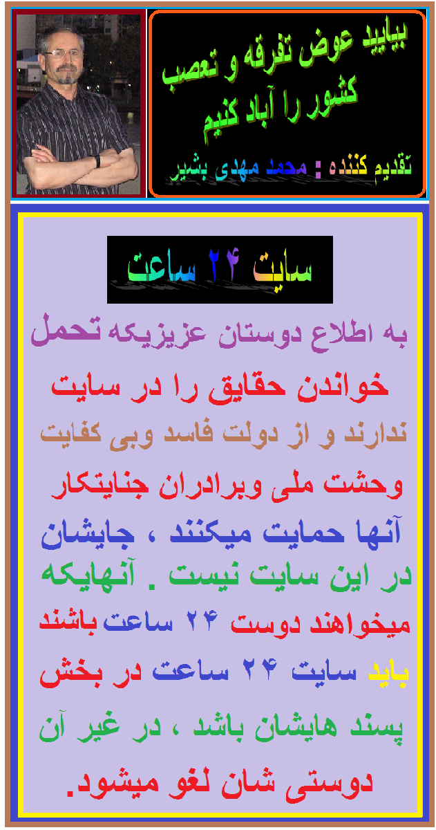 فرهنگي فرهيخته كشور، جناب محترم محمد مهدي بشير، خدمات شما بمثابه مؤسس و گرداننده سايت وزين ٢٤ ساعت قابل قدر و ستايش است!