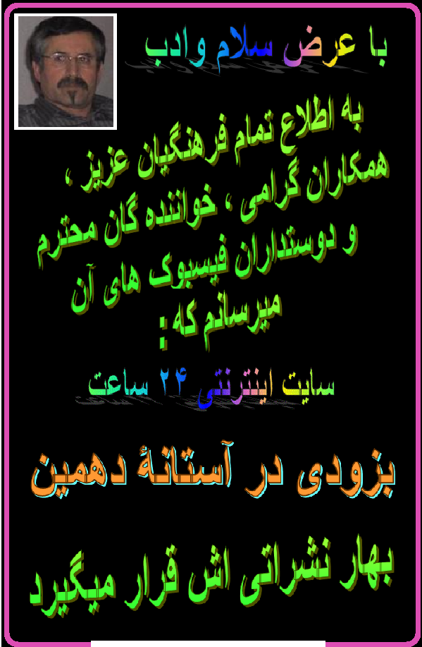 دهمین سالگرد سایت وزین 24 ساعت را برای شما گرداننده فرهیخته و چیره دست, همکاران قلمی, خواننده گان گرامی و جامعه فرهنگی کشور تبریک عرض میکنم, امید دارم این سایت غیر وابسته, آزاد و خواننده پسند, همچنان با نشر ژانر های گونه گون, تازه و تصاویر زیبا ادامه داشته باشد تا به تنوع و غنامندی رسانه های کشور ما بیفزاید.