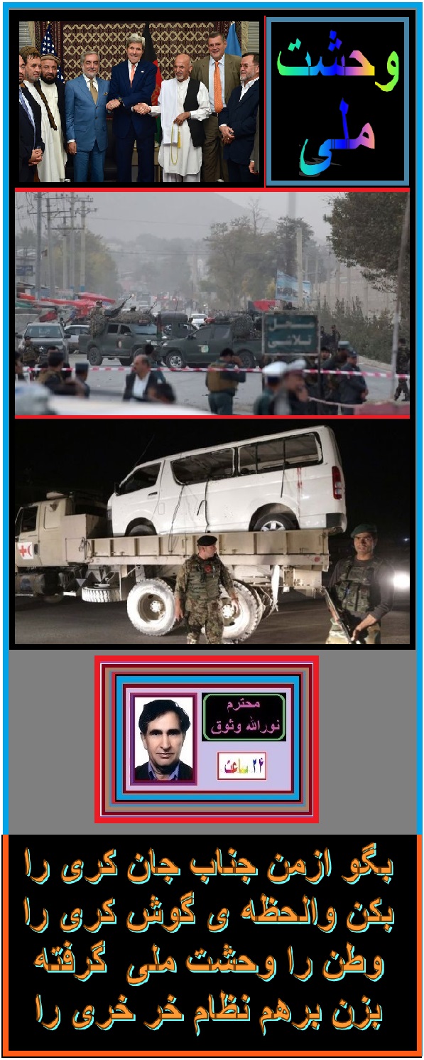 لعنت و نفرین به این دولت وحشت ملی وطنفروش عین الله و غین الله فاسد و دیگر ارگنشینان و حامیان برادران جنایتکار شان چون گلبیدین راکت انداز و سر دسته طالبان و داعشی های وحشی که همه روزه از این نوکر پاکستان دستور حملات انتحاری را میگیرند و مردم مظلوم و سربازان قهرمان ما را نا جوانمردانه به شهادت میرسانند. تشکر از جناب محترم نورالله وثوق که مانند همیشه عالی سروده اند. موفق و سلامت باشید. مهدی بشیر