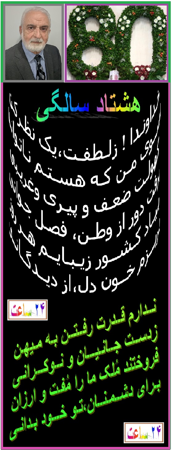 درود و توفقات زیاد الهی برشما باد. سپاس گذارم از تبریکی ،نشر ودیزاین بسیار زیبای شما راجع به هشتاد سالگی ام. عمر گذشتنی است، کوتاه یا طولانی، به هر صورت روزی باید این دهرفانی را وداع گفته وبه جهان باقی بشتابیم.