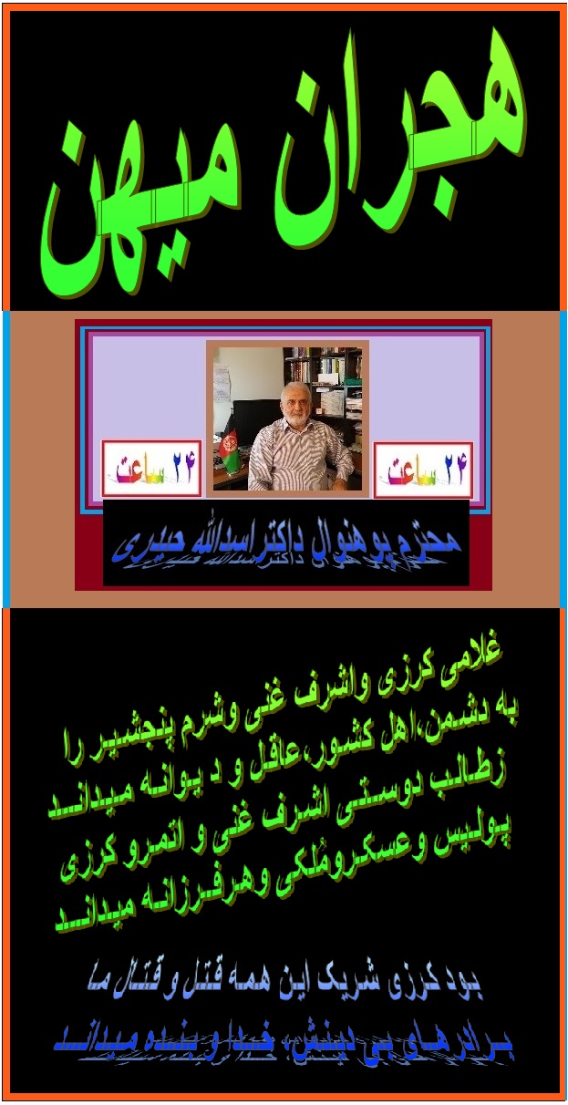 درود به برادر گرامی جناب محترم پوهنوال داکتراسدالله حیدری و تشکر از سروده زیبا و مملو از احساس پاک وطنپرستانه تان . خدا مهربان است که به زودی این خاینان فاسد و نوکران اجنبی همه روانه جنهم شوند و مردم ما آزادانه بتوانند به کشور خود برگردند و با هموطنان خود در سراسر افغانستان متحدانه بدون تفرقه و تعصب زندگی کنند. آمین یا رب العالمین . لعنت ونفرین به این جانی ها و آدمکش ها. موفق باشید . مهدی بشیر