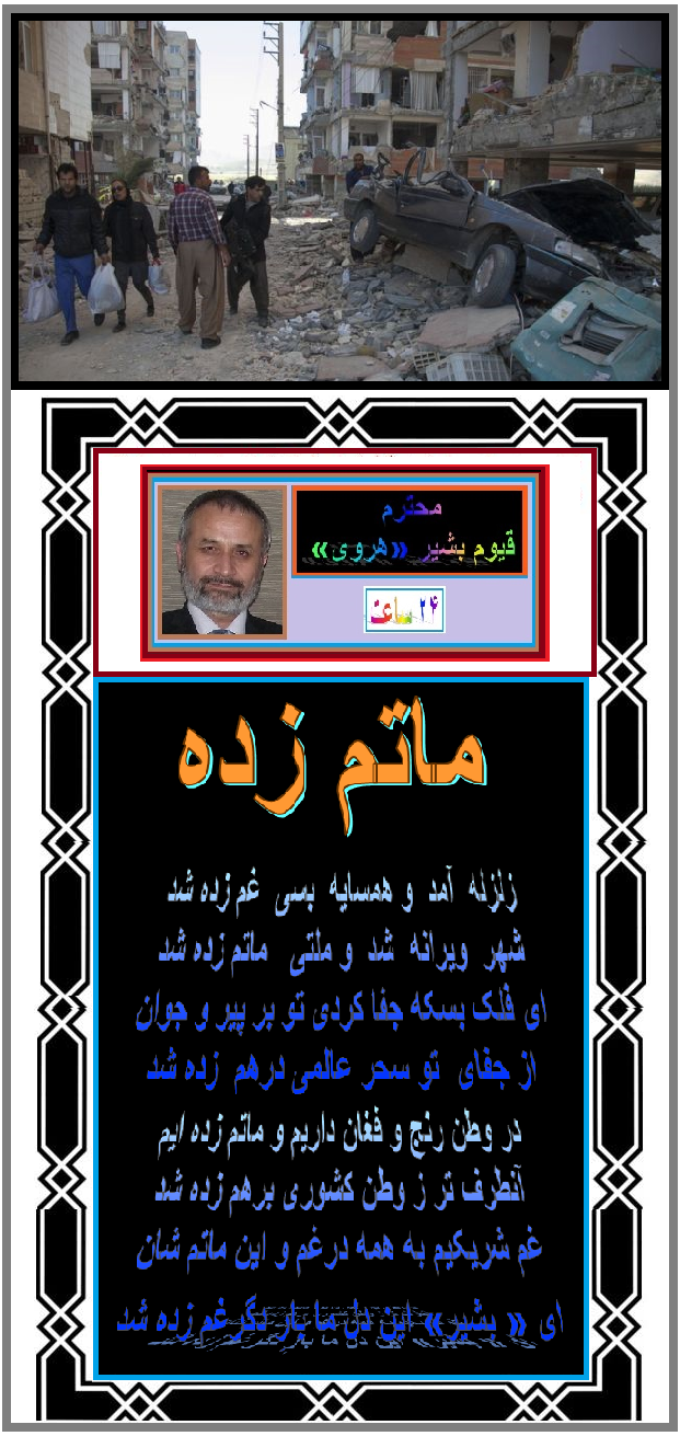 بنده هم مراتب تسلیت و همدردی خود را نسبت قربانیان زلزله اخیر کرمانشاه به خانواده های عزادار و مردم ایران تقدیم میکنم. روحشان شاد و خداوند مغفرت کند . همچنان به مجروحین این حادثه المناک شفای عاجل آرزو میکنم. تشکر از برادر عزیزم قیوم جان و سروده عالی شان. موفق باشید. مهدی بشیر