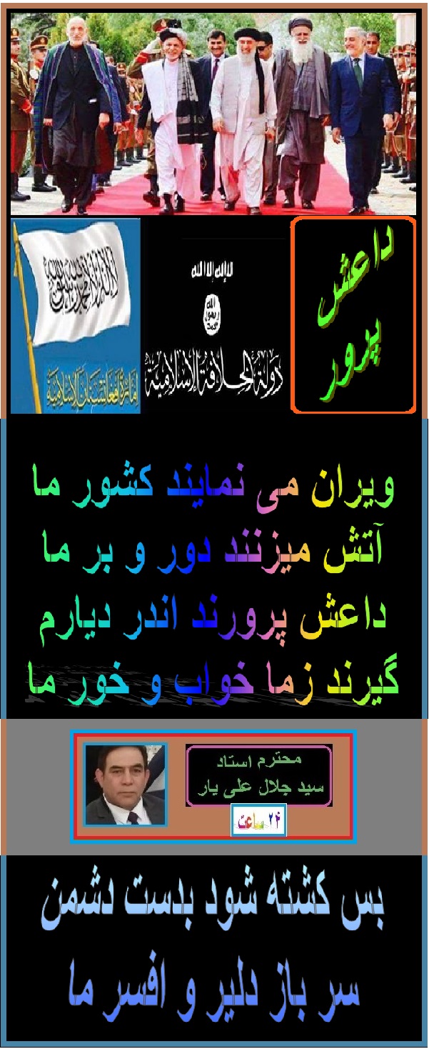 درود به برادر گرامی و استاد محترم آقای سید جلال علی یار ، تشکر از احساس پاک و طنپرستانه تان. بازهم این جانی ها و برادران طالبان و داعش ها تعدادی از هموطنان بیگناه مارا بشمول سربازان قهرمان را امروز در شهر کابل به شهادت رساندند . روح همۀ شان شاد و خلد برین جایشان .این ها همه بدستور ارگنشینان فاسد و گلبیدین راکت انداز برادر و رهبر داعش ها و طالبان وطنفروش صورت گرفته است . لعنت ونفرین به این داعش پرورهای جانی و طالب پرور های وحشی . موفق وسلامت باشید. مهدی بشیر