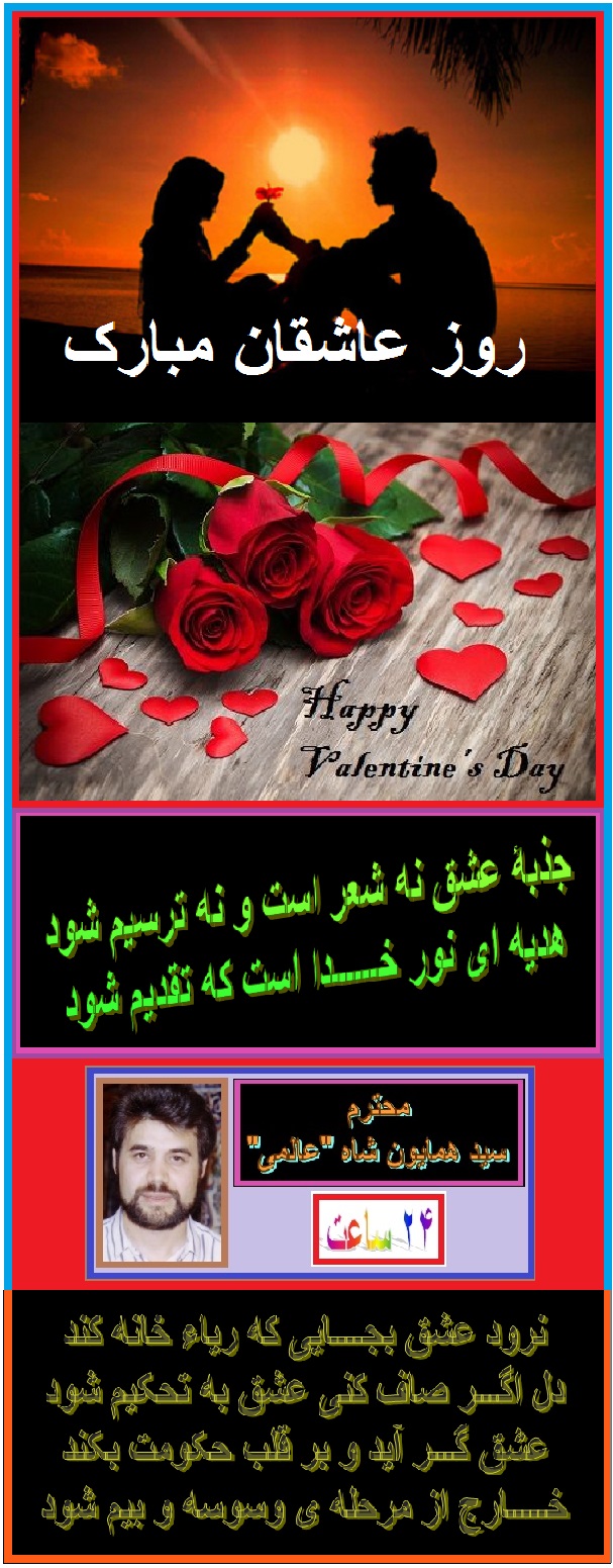 روز عشق به تمام عاشقان عزیز مبارک ، تشکر از برادر گرامی جناب عالمی عزیز ، سروده زیباست. این روز بشما هم مبارک. امیدوارم که سالهای سال در کنار خانواده محترم از این روز تجلیل نمایید. موفق وسلامت باشید. مهدی بشیر