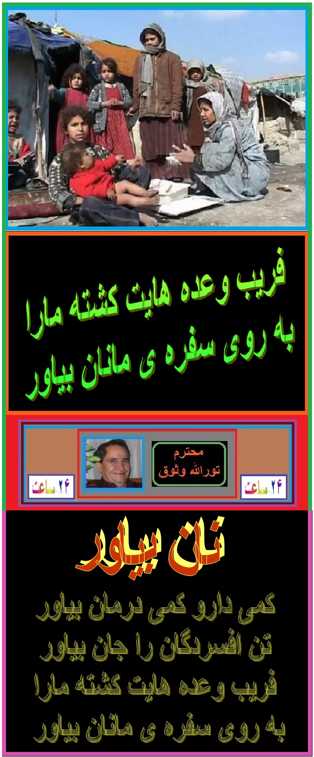 جهانی سپاس از جناب محترم وثوق عزیز و احساس پاک شان. این دولتمدان خاین ، فاسد وتقلب کار که بافریب و نیرنگ خود را به قدرت رساند اصلا به وعده های چرب و ودروغ خود وفاه نکردند ، زیاد تر مردم مظلوم ما نه خانه ، کار ، دوا ، داکتر و از همه بدتر نان خشک هم ندارند که با خانواده های خود بخورند ، یا باید دزدی کنند و یا گدایی. لعنت به چنین دولتی که بفکر چور وچپاول است. موفق باشید. مهدی بشیر