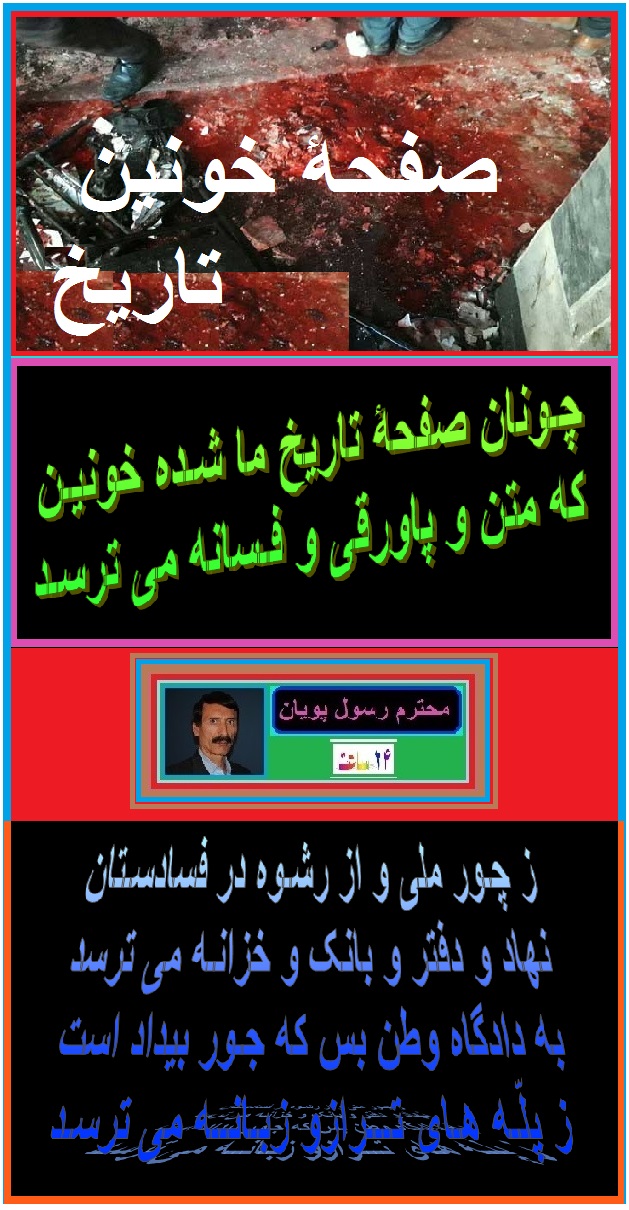واقعآ ارگنشینان و تفنگسالاران کشور ما را به ماتم سرا تبدیل نموده اند.که حتی پرنده گان و اسانها هم از لانه و کاشانه خود میترسند و دولت وحشت ملی کارشان چور ، چپاول ، دزدی ، آدمکشی ، فساد و وطنفروشی است. موفق وسلامت باشید. مهدی بشیر