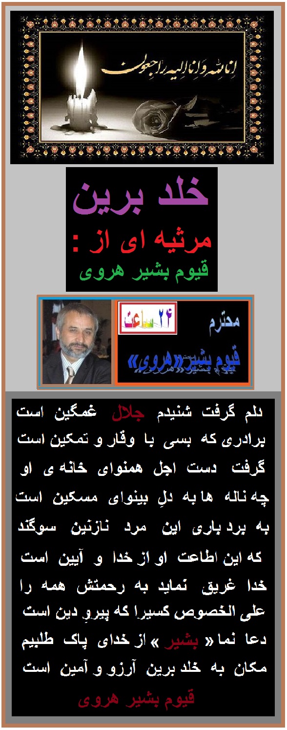 برادر بزرگوار و دوست عزیز و شاعر گرامی جناب آقای سید جلال علی یار مراتب تسلیت و همدردی خود و خانواده را نسبت و فات همسر گرامی تان بشما ، محترم نذیر ظفر ،فامیل های وابسته و باقی دوستان و اقارب شان تقدیم میدارم و برای مرحومه طلب رحمت و مغفرت و بشما و فامیل های وابسته صبر جمیل آرزو میکنم. روحشان شاد و خلد برین جایشان .از برادر عزیزم قیوم جان بشیر تشکر که به این مناسبت مرثیه ای تقدیم نموده است. بازهم به دوستان محترمم جناب علی یار عزیز و ظفر گرامی صبر میخواهم . مهدی بشیر