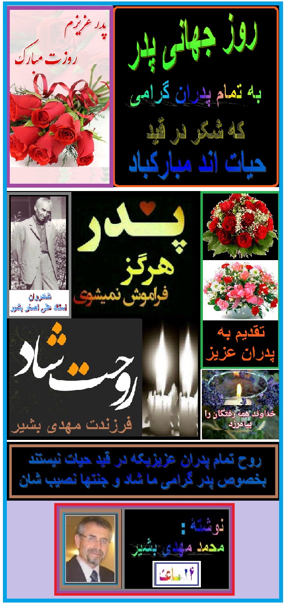 نوشته نهایت عالی جناب محترم بشیر صاحب! روز پدر را به شما و تمامی پدران زحمتکش و نیک تبریک و تهنیت میگویم.