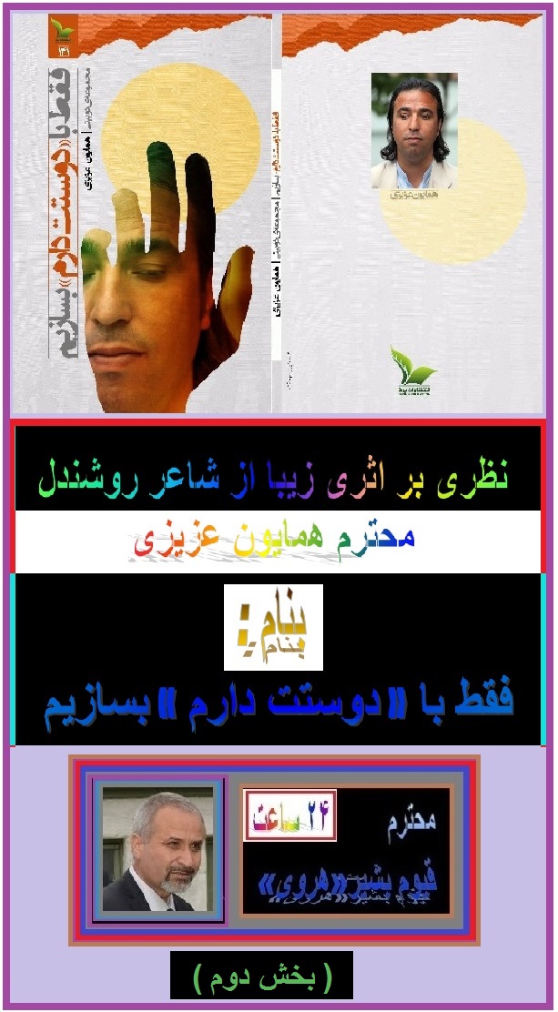 دیدیم که این مادر و پدر اینرا به اثبات رسانیدند که پس از هر شب سیاه یک سپیده دم روشن فرا می رسد ، بشرط آنکه با استقامت و صبر با امید زندگی کرد و پرده های ناامیدی را درید. خانواده ی همایون این را ثابت کردند که امیدوار بودن بمراتب بهتر است از ناامیدی ها و خواستن توانستن است ، وانگهی که تو بخواهی . گذشتن از چنین دوران تلخ و دشوار آنهم در کشوری مثل افغانستان که بارها بهاء قربانی بهانه شده است کار بسیط و ساده ای نیست . ما بارها دیدیم که به نسبت دخالت های بیجای بستگان ، شیرازه زندگی خیلی از انسانها از هم گسسته و حتی به ورطه نابودی کشانیده شده است . متأسفانه دخالت کردن در امور دیگران تاحدی یک امر عادی تلقی شده و بدون توجه به پایان تلخ آن هنوز هم درمیان بسیاری از فامیل ها جریان دارد که می توان ریشه ی آنرا در فقر فرهنگی جست و جو نمود که با دریغ و درد دامنگیر تعداد قابل ملاحظه ای از مردم بوده و است.