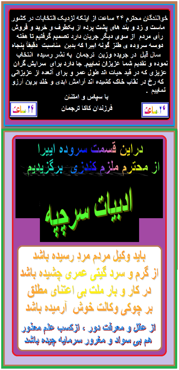 خوانندگان محترم ۲۴ ساعت از اینکه نزدیک انتخابات در کشور ماست و زد و بند های پشت پرده از یکطرف و خرید و فروش رأی مردم از سوی دیگر جریان دارد تصمیم گرفتیم تا هفته دوسه سروده ی طنز گونه اییرا که بدین مناسبت دقیقآ پنجاه سال قبل در جریده وزین ترجمان به نشر رسیده انتخاب نموده و تقدیم شما عزیزان نماییم. جا دارد برای سرایش گران عزیزی که در قید حیات اند طول عمر و برای آنعده از عزیزانی که رخ در نقاب خاک کشیده اند آرامش ابدی و خلد برین آرزو نماییم.