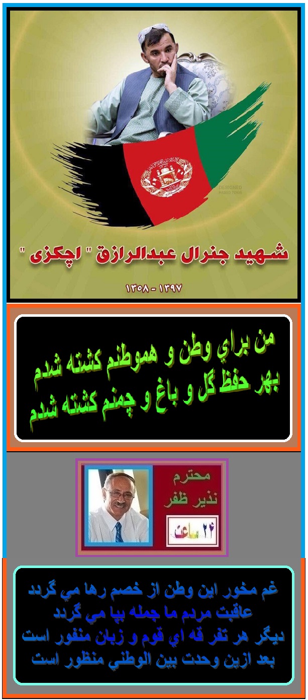 درود به برادر محترم و گرامی و شاعر آزادمنش جناب آقای نذیر جان ظفر ، تشکر از احساس پاک وطنپرستانه تان. روح شهید جنرال رازق قهرمان شاد . باید به عرض برسانم که حامیان قاتل او طالبان نیکتایی پوش وارگنشینان فاسد و بخصوص راکت انداز و برادرانش اند . لعنت به قاتل و دستور دهنده گانش.