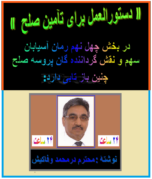 رییس مالک  بدون توجه به نمک خور، همسایه در به دیوار و رفیق اش، قلمی را از قلمدانی شیک سرمیزش برداشت، به ورق سفیدی که روی آن به خط درشت نوشته شده بود ”  دستورالعمل برای تآمین صلح ” خیره شد، با قلمش آنرا برجسته تر ساخت، سپس مثل آدمی که بعد از اجرای یک  کارخسته کن دماغی، بخواهد لحظه یی استراحت کند، خود راست کرد،  همزمان با فا ژه ییکه ازدهنش بیرون زده بود گفت: