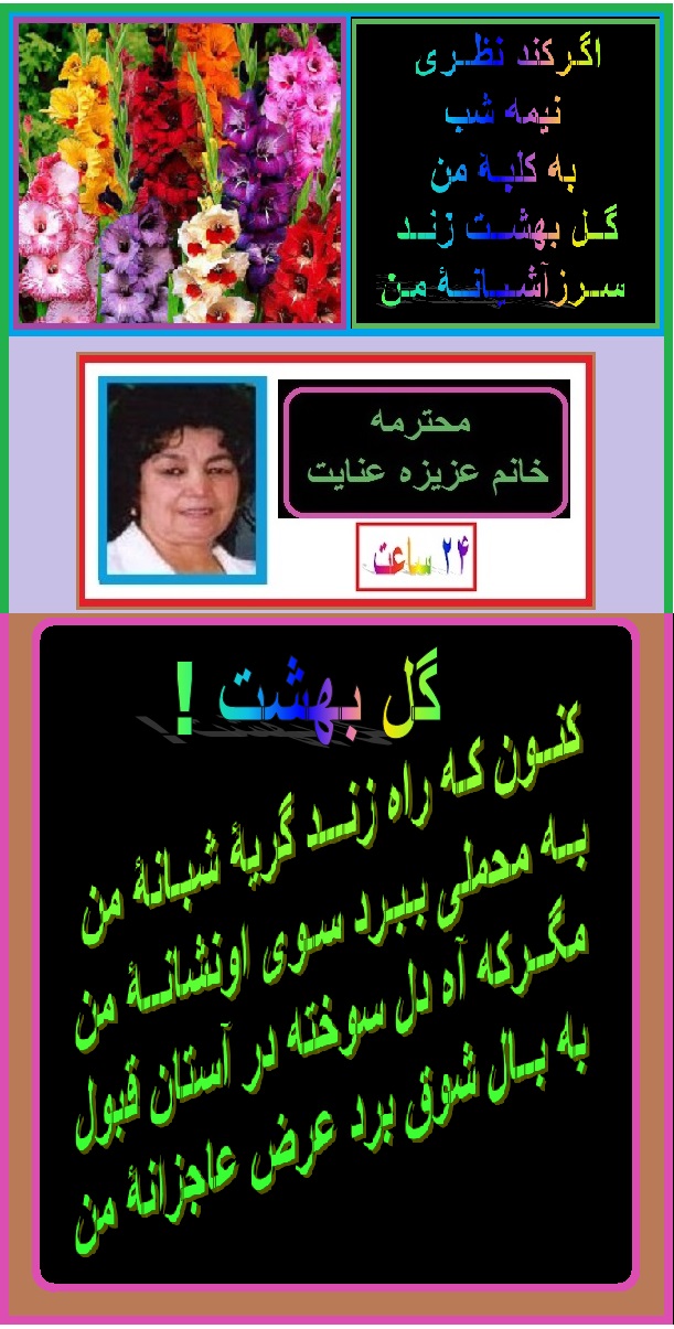 درود به خواهر گرامی ام خانم عزیزه جان عنایت ، تشکر از سروده زیبا و مانند همیشه عالیست. موفق وسلامت باشید. مهدی بشیر