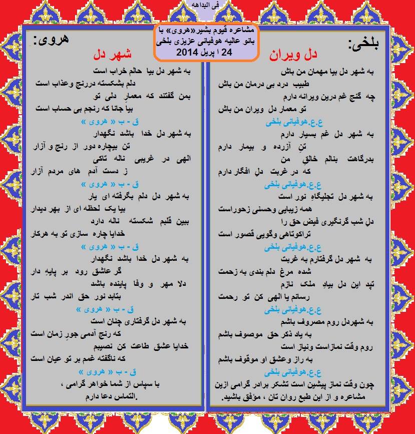 مشاعره با شاعر زیبا کلام ، خواهر گرامی ام محترمه عالیه جان هوفیانی عزیزی بلخی