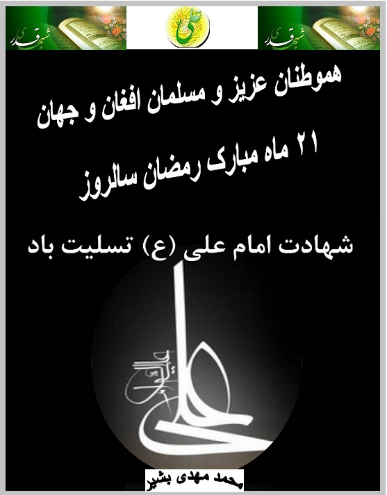 دوستان و هموطنان مسلمان افغانستان وجهان سلام و عرض ادب . اميدوارم طاعات و عبادات شما عزيزان مورد قبول درگاه حق قرار گرفته باشد. عزيزانم ، امروز شنبه ٢٨سرطان سال ١٣٩٣ كه برابر ميشود به ٢١ ماه مبارك رمضان سال ۱۴۳۵ هجری قمری و سالروز شهادت حضرت علي (ع) .