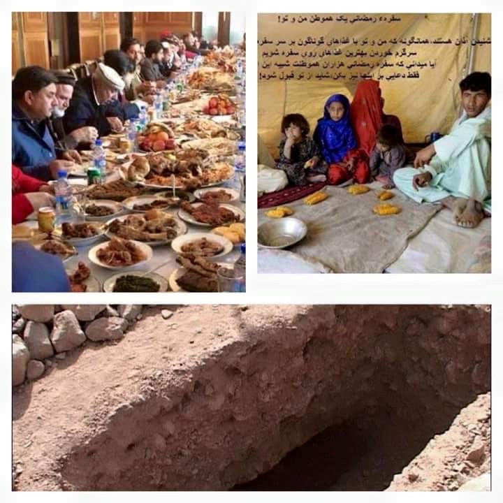 آیا درين ماه مبارك صيام كه روزه داري و توان مادي هم داري گاهي به فكر فقرا هم شده ايد ؟ أيا درطول سال يكبار فكرنموده ايد كه هموطن فقير ونادارت درچه حال است وچه ميخورند ؟ اما اين ماه مبارك تنها نخوردن و ننوشيدن از صبح تا شام نيست ؟ به فلسفه رمضان اگاه هستيد؟ در عكس بالا دسترخوان يا ميز نان توانمندان وسرمايه داران را نشان ميدهد كه چقدر پر وإسراف چقدراست .