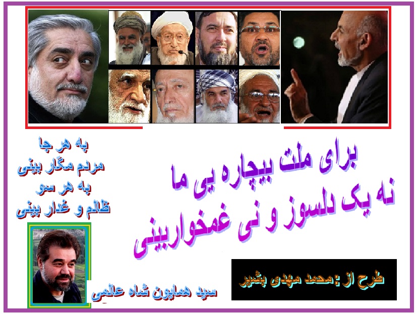 دوستان گرامی و خواننده گان فیسبوک های ما ، لطفا به عکس های بالا به دقت نگاه کنید ، فکر میکنید که این بیچاره ها چند روز میشود که حتا غذا نخوردند ، و پول ندارند که نان بخرند. اینطور نیست . اینها از جمله ملیارد ر های افغانسان و جهان اند و هرچه در کشور داشتیم آنها را فروختند به باداران پاکستانی و سعودی آدمخور خود بردند . نه پول نقد در کشور ماندند ، نه زمین رهایشی در بهترین مناطق خوب و نه هم مردم کشور مارا آرام گذاشتند تا با هم متحدانه زندگی کنند و یکی را بجان دیگر انداختند تا مردم مصروف شوند و گفته اند تفرقه انداز و حکومت کن . تشکر از دوبیتی شاعر گرانمایه ما آقای سید همایون شاه عالمی که این دوبیتی زیبا و واقعی را سروده اند و من آنرا دیزاین کردم و در آیند از این قسم اشخاص بیچاره ودر بدر را نشر خواهم کرد که چرا در بلند منزل های شیر پور و دیگر نقاط کشور زندگی میکنند و عوص پول افغانی دالر مصرف میکنند . خداوند ایشان را به جزای اعمال شان برساند.