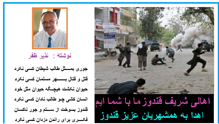 طبق اطلاعیه سازمان ملل در اثر سفوط ولایت قندوز در شمال افغانستان بدست طالبان و حشی و یا برادران کرزی و غنی و بی کفایتی دولت و حشت ملی و بی غیرتی اراکین وزارت های دفاع ، داخله ، امنیت دولتی و والی ودیگر اراکین ولایت قندوز بیش از صد نفر از هموطنان عزیز ما و سربازان قهرمان کشور ما بدست طالبان جنایتکار و یا نوکران حلقه به گوش آل سعود آدمخور و چتلستان جنایتکار به شهادت رسیدند و یا هم اسیر و زخمی شده اند و اضافه از شش هزار نفر دیگر هم آواره و در بدر شندند و خانه و کاشانه هایشان را ترک کردند وروانه دشت ها ولایات همجوار شدند.