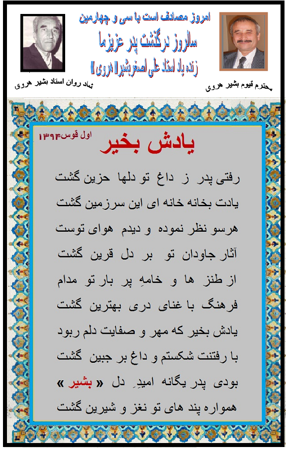 امروز مصادف است با سی و چهارمین سالروز درگذشت پدر عزیزما زنده یاد استاد علی اصغر بشیر « هروی » که بتاریخ اول قوس سال 1360 هجری شمسی در غربت سرای ایران وفات نموده و چشم از جهان پوشیدند.